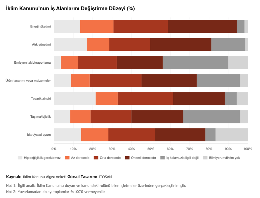 İşletmelere çeşitli faaliyet alanları sunularak "İklim Kanunu'nun belirtilen iş alanlarınızda ne ölçüde değişiklik yapmanızı gerektireceğini düşünüyorsunuz?" sorusu yöneltildi. Yanıtlar incelendiğinde, %35,53 gibi yüksek bir oranla enerji tüketimi alanında önemli düzeyde değişiklik yapılması gerekeceği ön plana çıkıyor. Bunu %31,58 ile atık yönetimi alanında önemli değişiklik gerekeceğini düşünen işletmeler takip ediyor. Ürün tasarımı veya kullanılan malzemelerde değişiklik gerekeceğini düşünen işletmelerin oranının (%28,51) görece yüksek olduğu, buna karşın emisyon takibi ve raporlamaya yönelik değişiklik beklentisinin (%23,68) daha sınırlı kaldığı görülüyor.