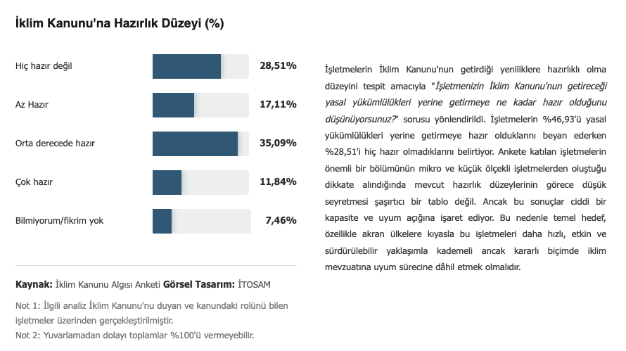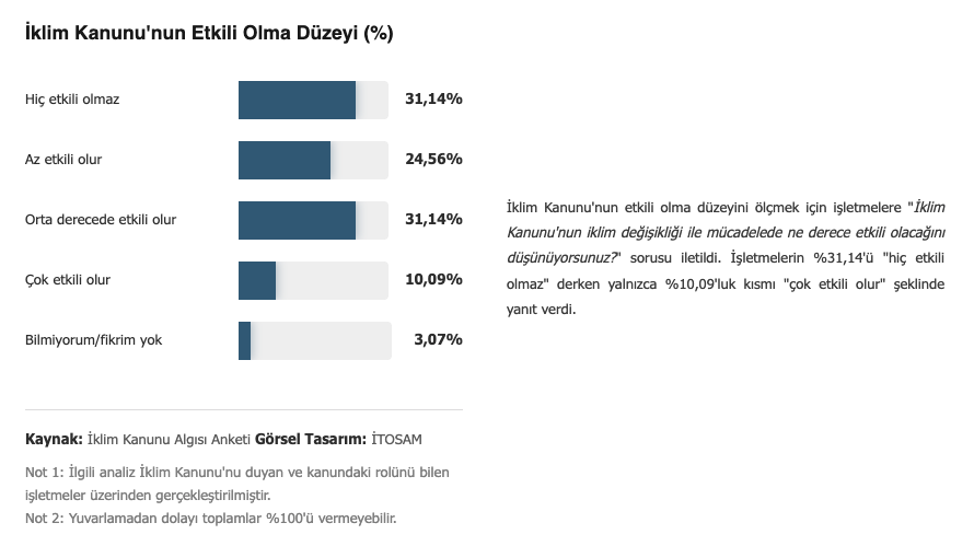 İşletmelere öncelikli olarak "Türkiye'de yürürlüğe giren İklim Kanunu'nu duydunuz mu? Duyduysanız, içeriği hakkında bilginiz var mı?" sorusu yöneltildi. İşletmelerin %55,03'ü "Evet, duydum ama içeriğini bilmiyorum" derken %25,76'sı ise "Evet, duydum ve içeriği hakkında bilgim var" seçeneğini işaretledi. Bu yanıtlar işletme ölçeklerine göre değerlendirildiğinde, Kanun'un içeriğine hâkim olduğunu belirtenlerin oranı mikro işletmelerde %22,67, küçük işletmelerde %31,13, orta ölçekli işletmelerde %33,33 ve büyük ölçekli işletmelerde %38,10 olarak tespit edildi. Kanun'u hiç duymadığını belirten işletmelerin oranı ise orta ölçekli işletmelerde %7,84 ile en düşük; mikro ölçekli işletmelerde %21,12 ile en yüksek seviyede gerçekleşti.
