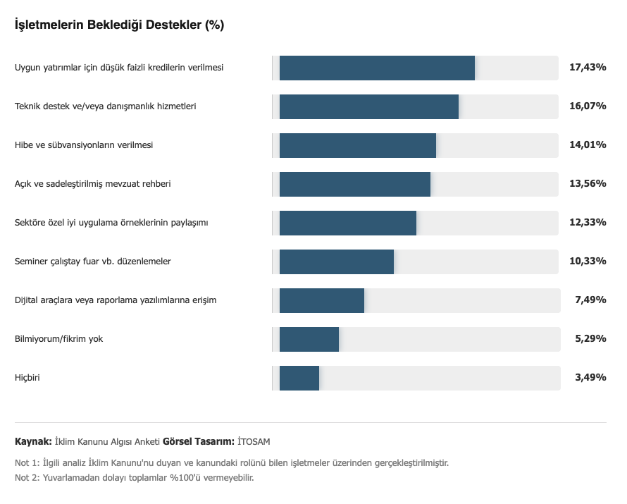 Son olarak işletmelere "İklim Kanunu'na uyum sağlamanızda işletmenize hangi tür destekler yardımcı olur?" sorusu soruldu. İşletmeler uyum sağlama sürecinde en fazla desteği (%17,43) uygun yatırımlar için sağlanacak düşük faizli kredilerin sağlayacağını düşünürken bunu teknik destek ve/veya danışmanlık hizmetleri (%16,07) izliyor. Açık ve sadeleştirilmiş mevzuat rehberi ise hibe ve sübvansiyonların ardından geliyor.