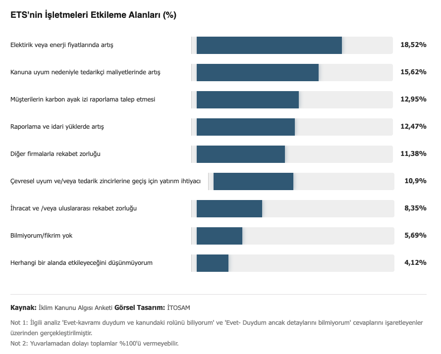 ETS'nin işletmelerin iş alanlarını nasıl etkileyeceğine dair algıyı ölçmek amacıyla "İşletmeniz doğrudan ETS kapsamında olmasa bile ETS'nin işletmenizi dolaylı olarak hangi alanlarda etkileyeceğini düşünüyorsunuz?" sorusu yönlendirildi. Buna göre işletmeler %18,52 ile ETS'nin elektrik veya enerji fiyatlarında artışa neden olacağını belirtiyor. Bunu %15,62 ile Kanun'a uyum nedeniyle tedarikçi maliyetlerinde artış izliyor. Müşterilerin karbon ayak izi talep etmesi ve raporlama ve idari yüklerde artış da beklenen diğer etkiler arasında yer alıyor.